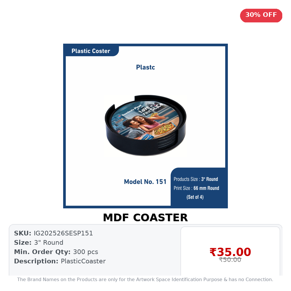 MOQ: 300 pcsProduct Size: 3″ RoundShort Description: PlasticCoaster