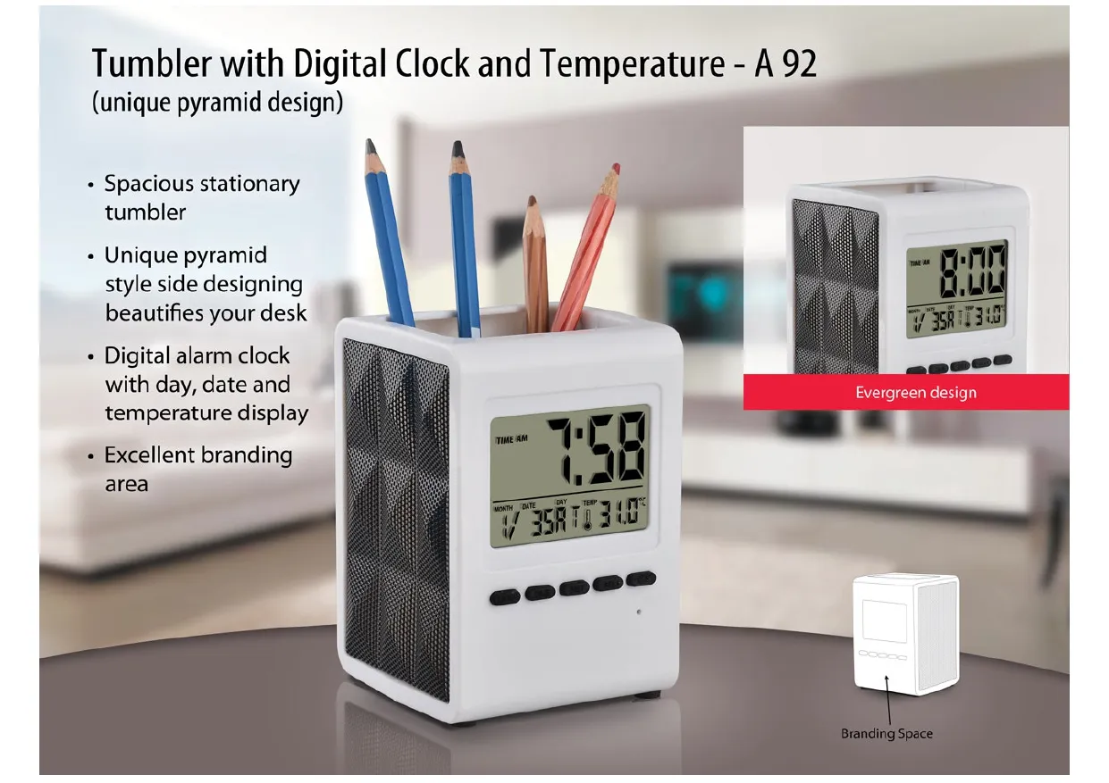 Rotating clock with 3 side branding area | Has pen stand & large stationery holder | Branding included MOQ 500 pc